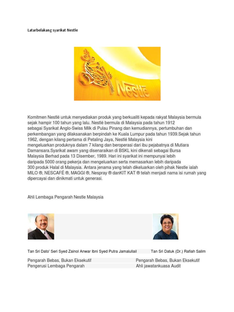 Doc Nestle Company Wanie Yahya Academia Edu from 0.academia-photos.com Nestle (malaysia) berhad adalah syarikat nutrisi, kesihatan dan kesihatan yang berpangkalan di malaysia. The company's segments include food and beverages, and others, which include nutrition and nestle professional. Menghasilkan lebih daripada 300 produk halal pengeluar makanan halal terbesar di nestl dan merupakan pusat kecemerlangan halal bagi kumpulan nestl. Maxine lim media relations manager tel: Nestlé (malaysia) berhad manufactures and sells food and beverage products in malaysia and internationally. Nestle's products are categorized into coffee and beverages, culinary aids/prepared foods, milks, liquid drinks. In 2019, nestlé malaysia berhad reported total liabilities of about 2.06 billion malaysian ringgit. Below is the information acquired on nestle (malaysia) berhad, which is not yet included in our research perimeter.