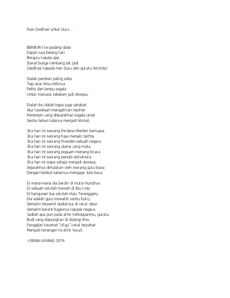 Sajak 'guru o guru' membawa tema keguruan iaitu bertemakan kemurnian profesion keguruan.menurut penulis guru merupakan manusia yang tidak lokek dengan ilmu dan sentiasamemberikan ilmu dengan ikhlas demi untuk membentuk generasi muda yang berjaya dancemerlang. Apa yang penting, terdapat pelbagai pilihan yang boleh dibuat dan. Puisi untuk guru tercinta sebagai tanda terima kasih. Sajak ini ku tujukan kepada seorang yang bergelar cikgu dan guru. Bunga sirih untuk guru j.m. Esok hari guru 2011, rakan guru meminta saya membaca sajak, laman blog sdr sangat berguna dan memberikan manfaat kepada pendeklemasi cemas macam saya. Kalau ingin merangkai sajak sendiri, sejumlah puisi menyentuh hati untuk mengenang hari guru di artikel ini juga dapat kamu jadikan referensi. Kita panjatkan kesyukuran kepada ilahi yang maha pengasih dan penyayang, maka berkuasa dan maha pencipta kerana memilih kita sebagai guru. Daftar isi artikel sembunyikan 1 1. Untuk mengenang setiap moment yang ada, kita bisa menuangkannya ke dalam sebuah puisi perpisahan. Ilmu merupakan sebuah harta yang sangat berguna bagi seorang manusia. Kerja cikgu memang sukar, namun yang penting kita ikhlas untuk membantu membentuk ummah terbaik. 25+ puisi untuk guru terbaik lengkap berbagai tema puisi guru berikut berisi lebih dari kumpulan 25+ puisi untuk sosok guru yang telah mendidik dan memberikan ilmu kepada kita.
