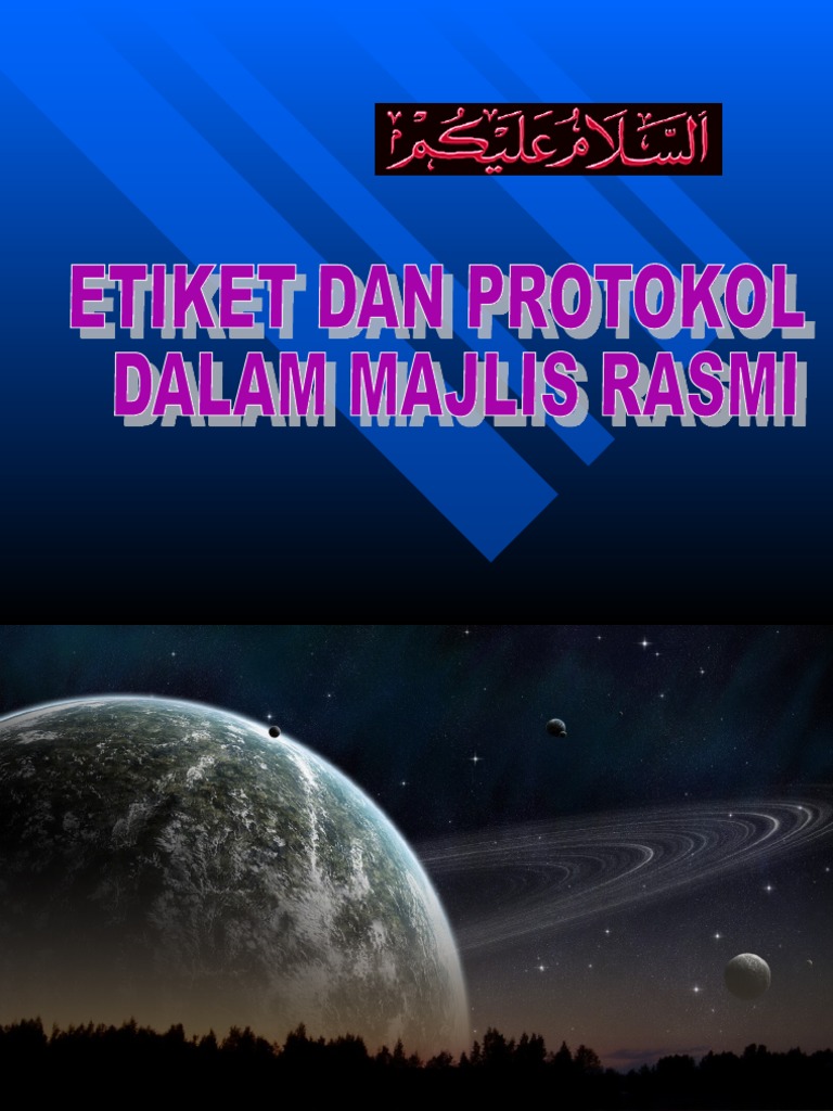 Majlis tidak formal 3.5 protokol jamuan i. Susunan penuh dalam dewan 2 1 38 6 4 5 7 9 Majlis rasmi majlis tidak rasmi susunan keutamaan susunan tempat duduk susunan ketibaan dan kepulangan susunan dan kibaran bendera panggilan hormat pakaian bahasa istana jenis jemputan m o d u l te ra s k e b u d a y a a n 34 definisi • protokol berasal daripada perkataan greek: Aturcara program / sambutan 9. Pegawai protokol dan penyambut tetamu. Protokol panggilan hormat dan susunan bendera; Protokol susunan tempat duduk ; Adakah kita menganjurkannya dengan penuh 'protokol' yang betul? Kesempurnaan pakaian duduk dalam majlis 17. Tetamu kehormat (tk) = tuan rumah (tr) jika dalam. Tertib ketibaan tetamu kenamaan dalam majlis formal; Definisi majlis perjumpaan (rujuk kamus dewan, edisi ketiga, m.s 843) dengan maksud perihal berkumpul atau berhimpun. Secara ringkasnya, 'protokol' berkaitan dengan peraturan dalam penganugerahan darjah kebesaran, susunan keutamaan, panggilan hormat, jemputan, tempat duduk dan sebagainya.